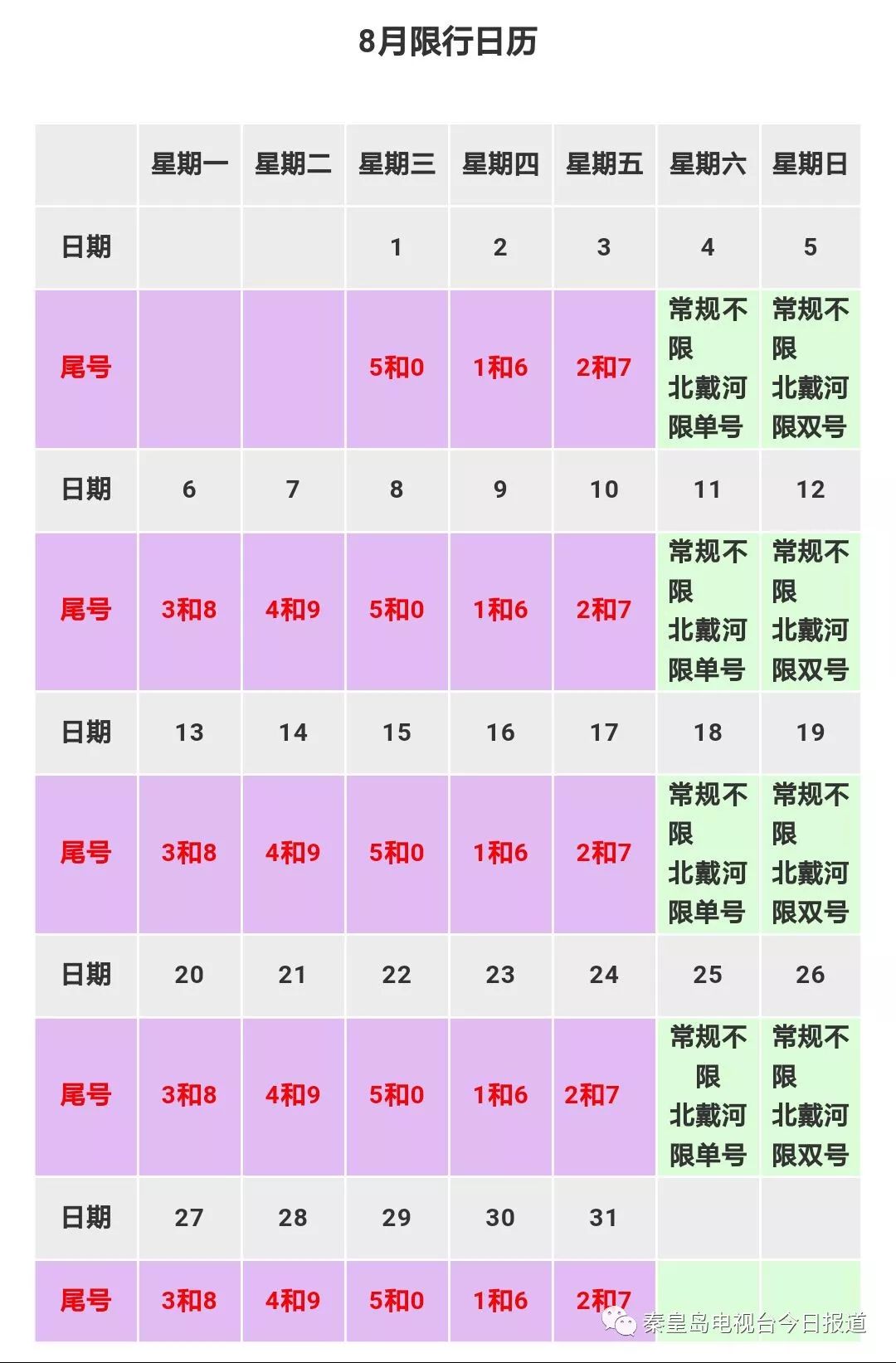 🚗秦皇岛最新限号表: